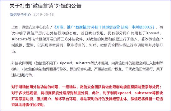 2019年6月18日,微信發(fā)布《關于打擊"微信營銷"外掛的公告》