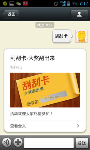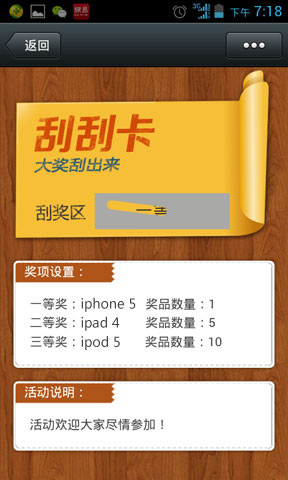 刮刮卡活動(dòng),直接發(fā)布刮刮卡活動(dòng),設(shè)置活動(dòng)內(nèi)容、獎(jiǎng)項(xiàng)及中將比例,帶給粉絲完全不同的感受。輸入“刮刮卡”體驗(yàn)此互動(dòng)活動(dòng)
