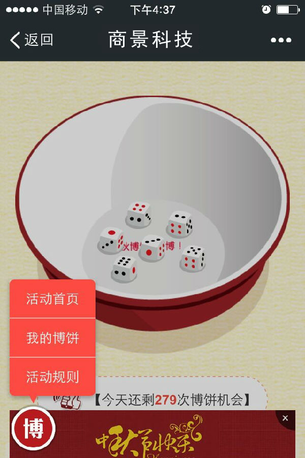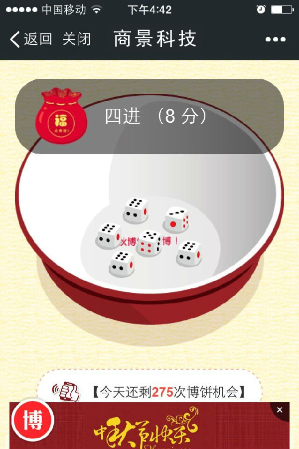 中華文明博大精深,民間文化源遠流長,各具特色。尤其體現(xiàn)在中秋佳節(jié)這一天,在這一天里,各地都有各自獨特的慶;顒樱恳环N慶;顒佣俭w現(xiàn)著當?shù)孛耖g文化或來源于當?shù)氐拿耖g傳說。在福建廈門,每逢中秋佳節(jié)臨近,夜色闌珊中,大街小巷便會傳出博餅時骰子撞碰瓷碗的悅耳叮當聲,節(jié)日的喜氣揚溢于清脆的骰子聲中。廈門的“博餅”,也叫“博中秋餅”、“博會餅”。