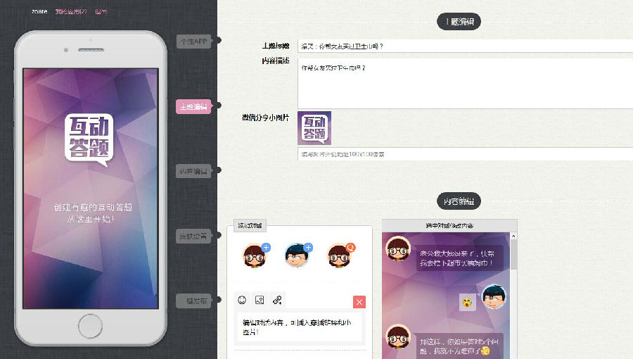 微信已經(jīng)成為我們生活中不能缺少的一部分,眾多功能被加入到了微信之中,你想知道朋友圈瘋傳的"老公,答對(duì)這5道題,今晚不用洗衣服,還有驚喜回報(bào)哦!"是怎么做出來的嗎?現(xiàn)在你不用羨慕別人了,創(chuàng)建有趣的互動(dòng)答題,就從這里開始。