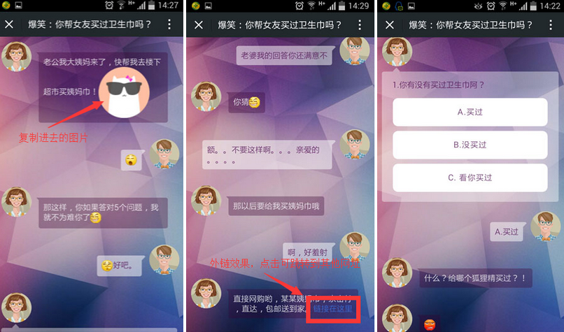 使用技巧:自由定義的主題皮膚,支持將圖片復(fù)制到對(duì)話內(nèi)容中,輕松一鍵發(fā)布,選擇題一點(diǎn)即觸發(fā),內(nèi)容自由設(shè)置,邏輯簡單易懂