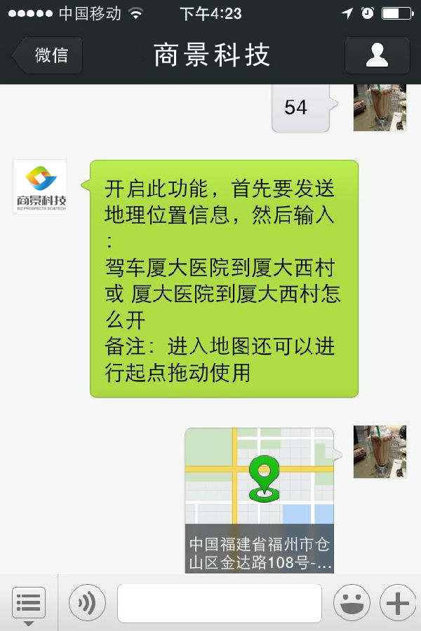 開啟此功能,首先要發(fā)送地理位置信息,然后輸入: 駕車廈大醫(yī)院到廈大西村 或 廈大醫(yī)院到廈大西村怎么開 備注:進入地圖還可以進行起點拖動使用