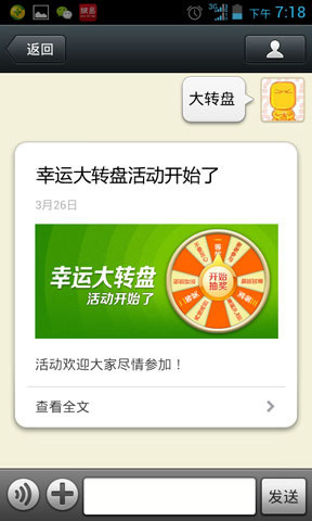 開啟此功能,直接發(fā)布幸運(yùn)大轉(zhuǎn)盤活動,設(shè)置活動內(nèi)容、獎項及中將比例,帶給粉絲完全不同的感受。 輸入"大轉(zhuǎn)盤"體驗此互動活動